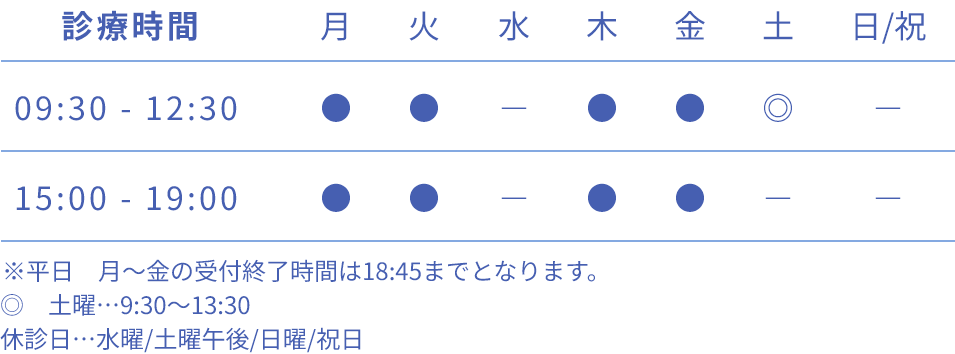 | 営業時間 | 月、火、木、金 →9時30分〜12時30分 15時〜18時45分、 土→9時30分〜13時30分 |